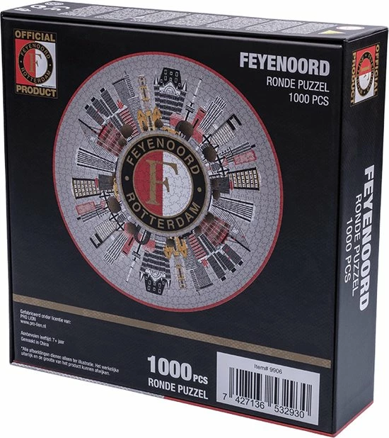 Deze Feyenoord-puzzel is een must have voor alle supporters. Een ronde puzzel met het logo van Feyenoord en de skyline van Rotterdam. Weet jij alle bekende Rotterdamse gebouwen aan elkaar te puzzelen?