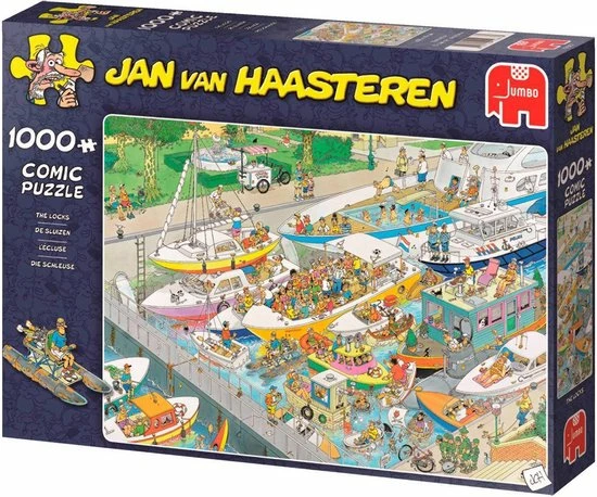 Wat een drukte in De Sluizen van Jan van Haasteren. Als dat maar goed gaat! Een geweldige puzzel met 1000 puzzelstukjes. Tijdens het puzzelen kom je steeds meer grappige details en taferelen tegen. Een kleurrijke plaat waarbij Jan van Haasteren wederom laat zien dat humor op een geweldige manier kan worden verwerkt in een puzzel. Jan van Haasteren puzzels zijn puzzels met veel kleur en details. Jan van Haasteren tekent al decennia lang humoristische platen die je steeds weer verrassen en laten lachen. De echte fans kennen de specifieke kenmerken van Jan van Haasteren en zoeken in elke puzzel direct naar de haaienvin, Sinterklaas, de handjes, het kunstgebit en Jan?s zelfportret. Jumbo heeft tientallen Jan van Haasteren puzzels in de collectie van 54 tot maar liefst 5.000 puzzelstukjes.