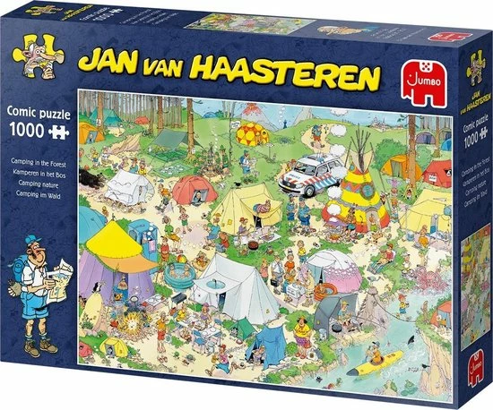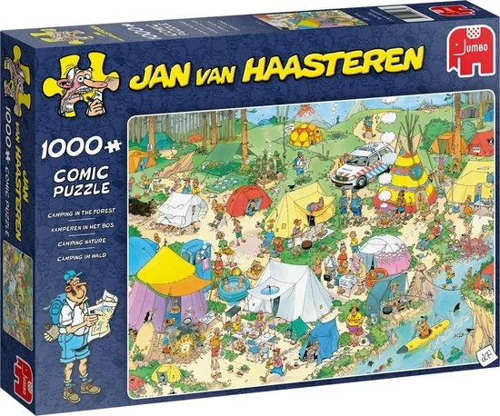 Jan van Haasteren Kamperen in het Bos met 1000 Stukjes is een van de nieuwe puzzels van Jan van Haasteren. Tijdens het kamperen verloopt niet alles even soepel. Kamperen in het Bos van Jan van Haasteren is een puzzel met 1000 stukjes voor de echte Jan van Haasteren fans! Zodra je Jan van Haasteren Kamperen in het Bos met 1000 Stukjes begint te puzzelen stuit je op het ene na het andere hilarische tafereel. Jan van Haasteren heeft ook deze keer weer laten zien dat humor op een prachtige manier kan worden verwerkt in een puzzel. Jan van Haasteren puzzels zijn puzzels met veel kleur en details. Jan van Haasteren tekent al decennia lang humoristische platen die je steeds weer verrassen en laten lachen. De echte fans kennen de specifieke kenmerken van Jan van Haasteren en zoeken in elke puzzel direct naar de haaienvin, Sinterklaas, de handjes, het kunstgebit en Jan?s zelfportret. Jumbo heeft tientallen Jan van Haasteren puzzels in de collectie van 54 tot maar liefst 5.000 puzzelstukjes.