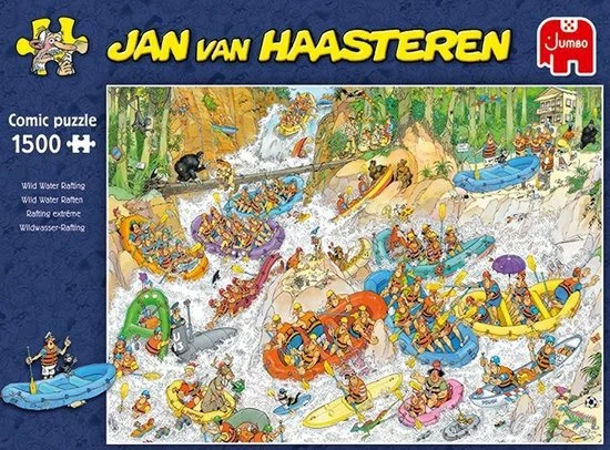 Ga je mee Wild Water Raften in de bossen? Met deze puzzel neemt Jan van Haasteren je mee in een bootje de rivier af. Wat kan er allemaal mis gaan? Een heleboel! Veel plezier met de nieuwste puzzel van Jan van Haasteren. Wild Water Raften is verkrijgbaar in 1500 en in 3000 stukjes.