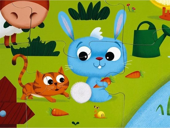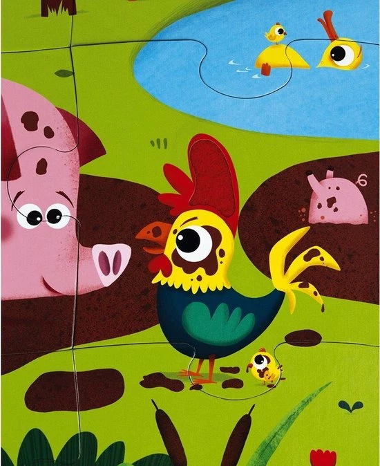 Kartonnen puzzel van Janod om de boeiende wereld van de boerderij en haar dieren te ontdekken! Je kindje zal zich vermaken met de diertjes te ontdekken en ze op de juiste plaats te puzzelen. Leuke kleurrijke puzzelstukken waarvan er 7 puzzelstukken zijn waarbij het kindje de diertjes op de rug kan strelen.