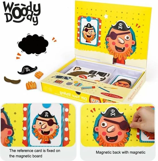 Een magnetisch plakboek met losse magneetjes waarmee je een gezicht kunt maken met losse haarstijlen, hoofdeksels, brillen, oortjes, neusjes en nog vele andere mogelijkheden.