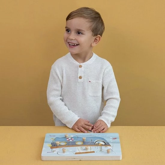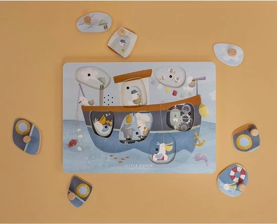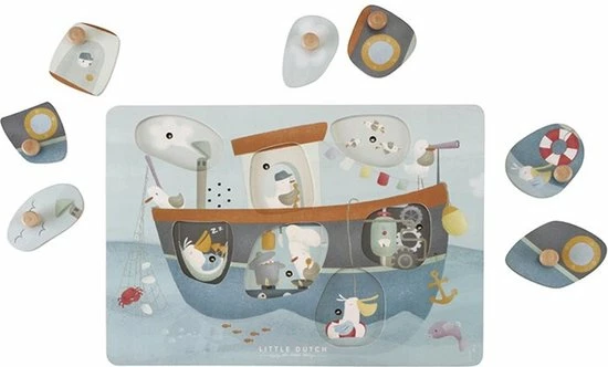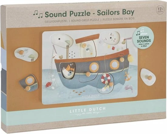 Hoeveel meeuwen kun je vinden bij de vissersboot die onderweg is naar Sailors Bay? Snurk, fluit en toeter mee! Til de puzzelstukjes ??n voor ??n op en ontdek de grappige geluidjes. De meeuwen blijven graag bij de boot om een visje te vangen! Weet je waar de pelikaan een dutje doet en wie er achter het roer staat? Vergeet vooral niet om te toeteren wanneer je klaar bent om op avontuur te gaan! Deze leuke puzzel van Little Dutch met 7 geluiden stimuleert de co?rdinatie en de woordenschat. De sensoren reageren wanneer er een puzzelstukje opgetild wordt en de afbeelding eronder onthuld. Wordt exclusief (2x AAA) batterijen geleverd.