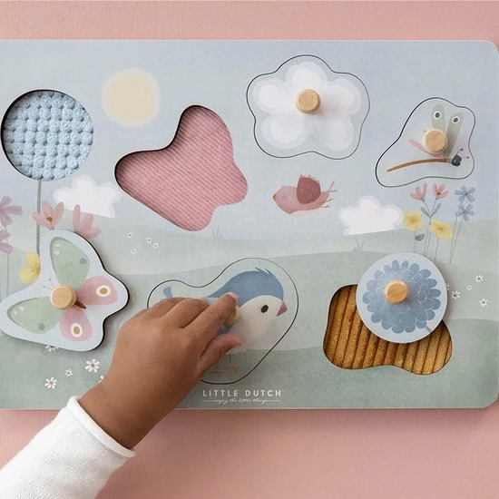 Wat zit er achter het vogeltje? Raak en voel de verschillende texturen onder elk stukje van de houten voelpuzzel. Is het zacht of geribbeld? Welke kleur zie je? Herkende jij de vormen van de rups en de vlinder? Deze voelpuzzel is geweldig educatief speelgoed voor kinderen, omdat het de fijne motoriek verbetert en de nieuwsgierigheid stimuleert door middel van zintuiglijk spel. Dankzij de houten pinnen kunnen kinderen de puzzelstukjes gemakkelijk hanteren en op de juiste plek leggen. Vanaf 12 maanden.