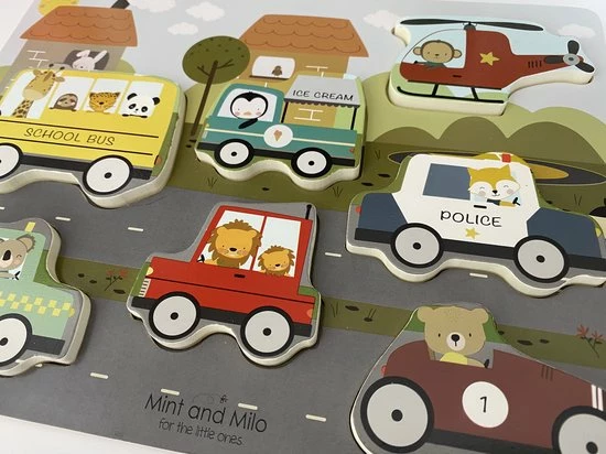 Houten voertuigen puzzel – HOUTEN VORMENPUZZEL MET AUTO’S – Mint and Milo
