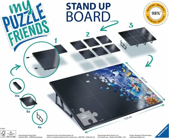 Het bord is gemaakt van zwart, 98% gerecycled materiaal en stabiel, maar toch zo licht dat het makkelijk te vervoeren is. De ergonomische ezel is ontworpen voor het formaat van een legpuzzel van 1000 stukjes in liggend formaat.