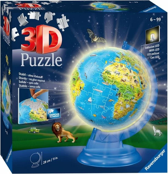 De stevige plastic stukjes passen precies in elkaar. Zo bouw je vanuit gebogen, platte en vouwbare stukjes de unieke Ravensburger XXL Puzzel Kinderglobe Night Edition, zonder lijm te gebruiken! Uniek drie dimensionaal puzzelplezier, dat zijn de 3D puzzels van Ravensburger! Deze Night Edition globe is Engelstalig.