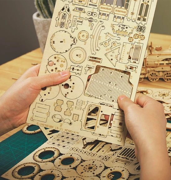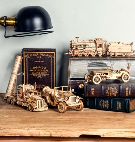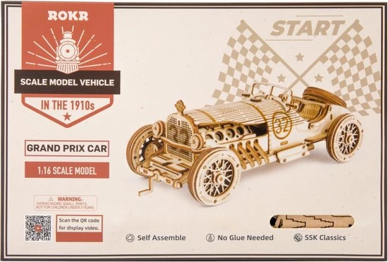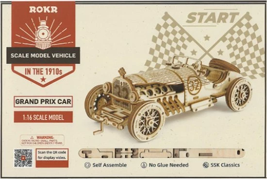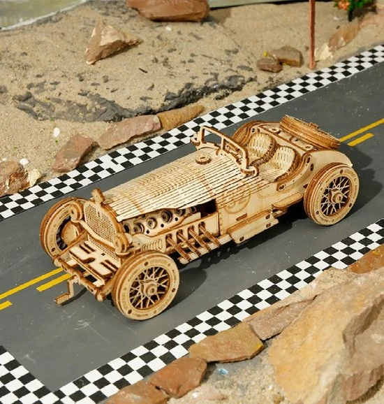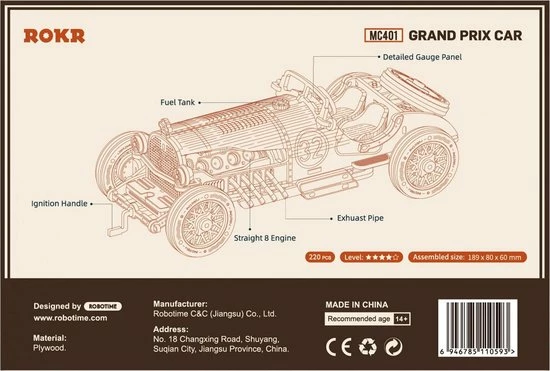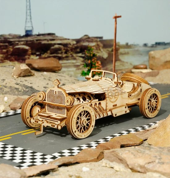 De houten 3D puzzel V8 Grand Prix Car bestaat uit 220 stukjes en eenmaal in elkaar gezet is hij 19 x 8 x 6 cm groot. Schaal model van de Grand Prix Car 1:16. Je hebt geen lijm nodig en het modelbouwpakket komt met een stapsgewijze instructie.